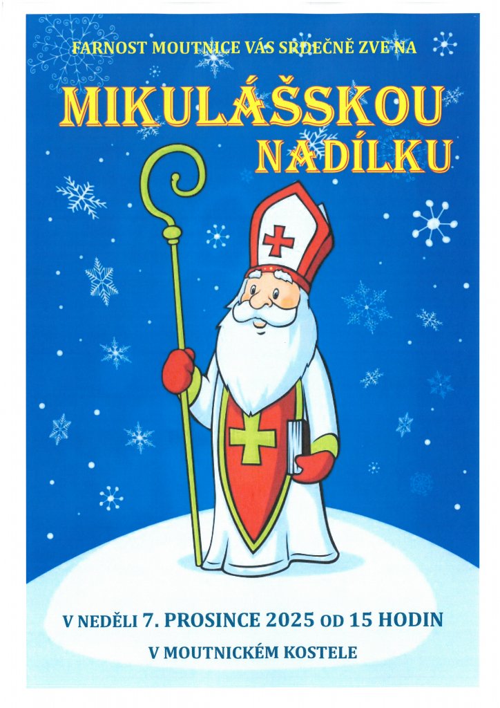 Farnost Moutnice Vás srdečně zve na Mikulášskou nadílku v neděli 7. 12. 2025 od 15 hodin v moutnickém kostele.