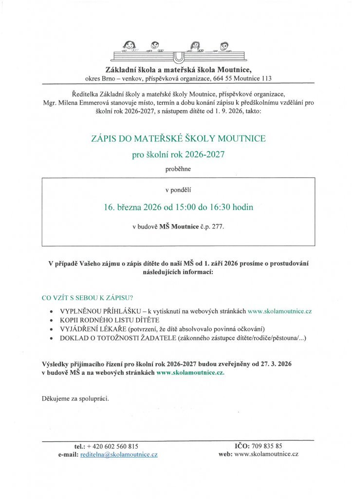 Zápis proběhne 16. 3. 2026 v MŠ Moutnice v době od 15.00 do 16.30 hodin.