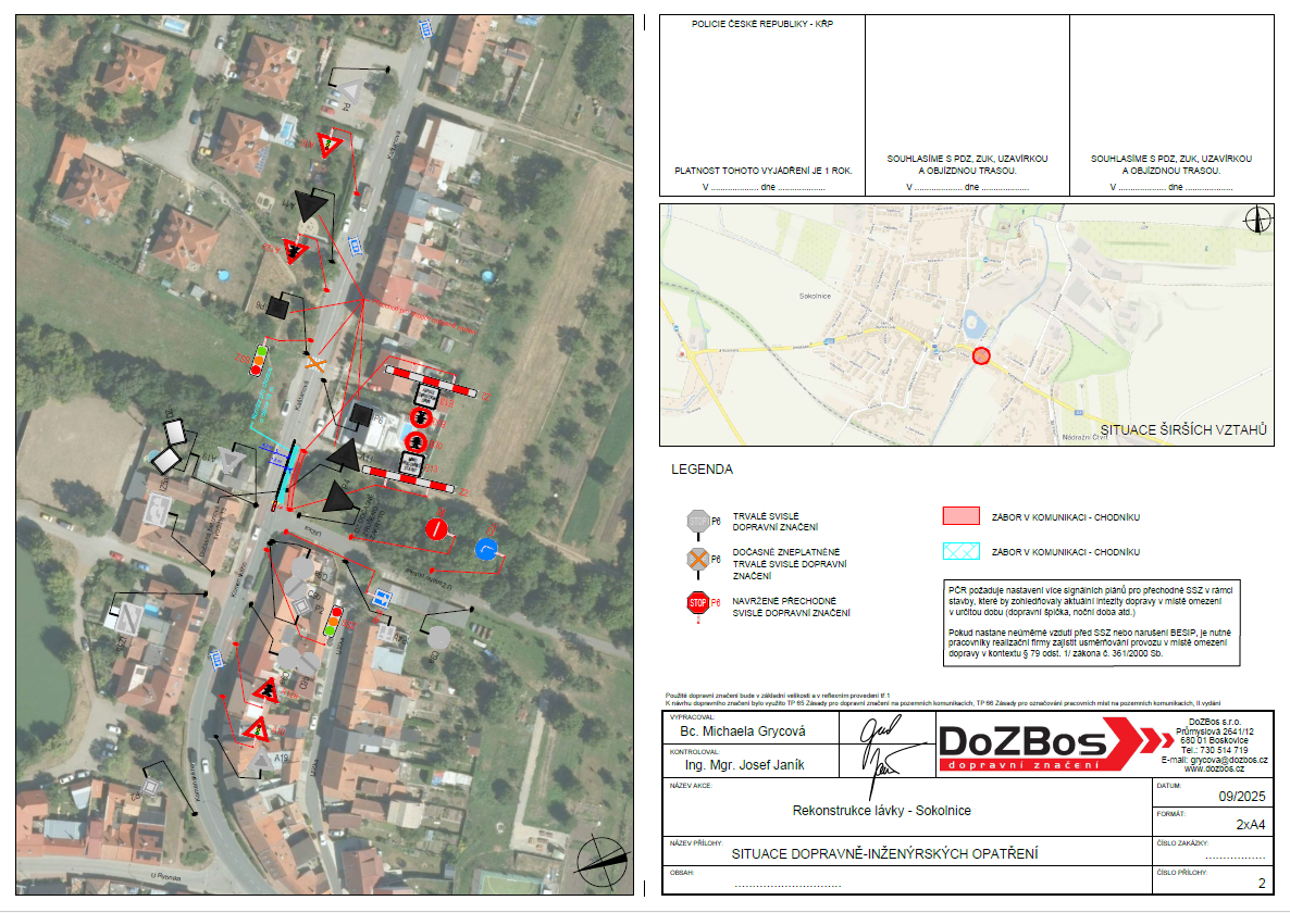 na základě provedené prohlídky mostního objektu pro pěší na ul. Kaštanová v Sokolnicích bylo zjištěno, že tento most vykazuje značně špatný technický stav (narušené železné vzpěry). Vedení obce Sokolnice tedy rozhodlo o jeho rekonstrukci, která bude spočívat v demontáži stávající pochozí části mostu, která bude nahrazena novým kompozitním materiálem, ošetřením konstrukcí nátěry a renovací zábradlí. Most pro pěší bude po celou dobu prací plně uzavřen. S ohledem na tuto skutečnost je nezbytné, z důvodu zajištění bezpečnosti silničního provozu, realizovat přechodnou úpravu provozu v uvedeném úseku pozemní komunikace. Pro průchod chodců bude na silnici č. II/418 v místě rekonstrukce realizován koridor vymezený dočasnými betonovými svodidly. Provoz vozidel bude sveden do jednoho jízdního pruhu a řízen semaforem.