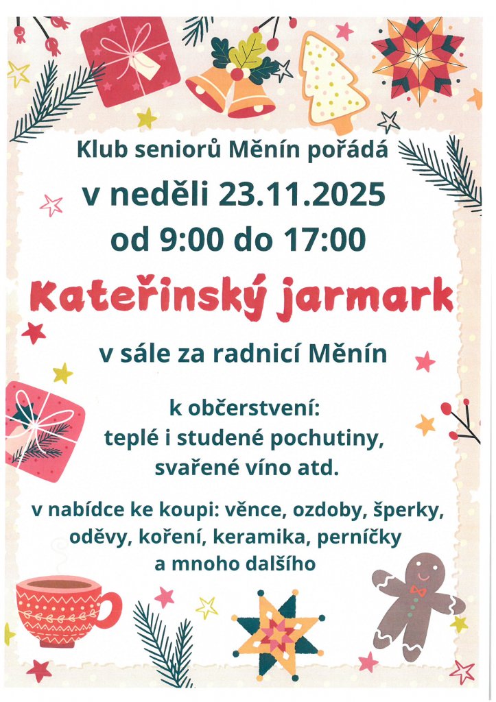 Klub seniorů Měnín pořádá v neděli 23. 11. 2025 v době od 9.00 do 17.00 hodin Kateřinský jarmark