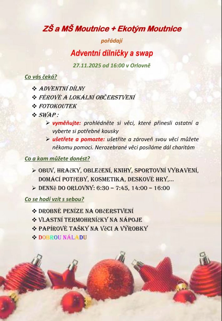 ZŠ a MŠ Moutnice pořádají adventní dílničky a swap.