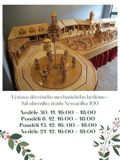 V sále OÚ Nesvačilka, Nesvačilka 100 můžete shlédnout dřevěný mechanický betlém v tyto dny a dobu: