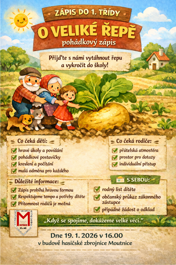 Zápis do 1. třídy Základní školy Moutnice, který se uskuteční dne 19. 1. 2026 v 16:00 v budově hasičské zbrojnice.
