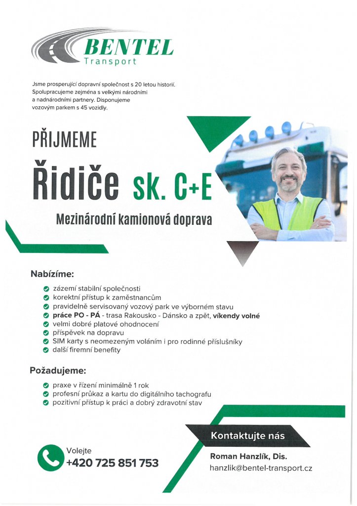 BENTEL Transport přijme řidiče sk. C+E pro mezinárodní kamionovou dopravu.