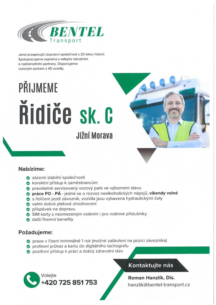 BENTEL Transport přijme řidiče sk. C pro oblast jižní Moravy.