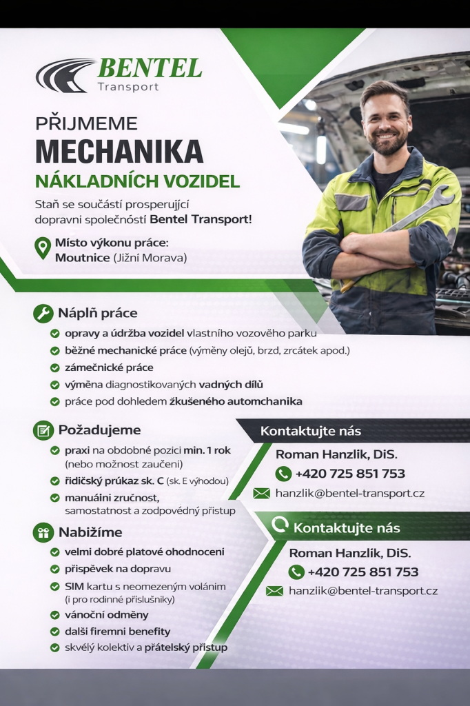 BENTEL Transport přijme mechanika nákladních vozidel, místo výkonu práce Moutnice (jižní Morava).